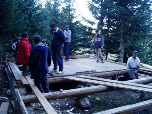 Lepo je krenulo ali smo ipak shvatili da nam treba stručna pomoć lokalnih majstora. Pošto mi nismo bili slobodni radnim danima a svaki dan nam je bio dragocen (jer se zima bliži), majstor Mehdija Đerlek iz Drage je sa svojim sinom prihvatio da uz pomoć trojice iz našeg društva sklopi brvnaru do krovnih greda (tzv. "rogova"). Ostalo je još da nam stignu nove daske za pokrivanje krova jer postojeći krov po našoj proceni nije bio dovoljan za surove uslove u planini.