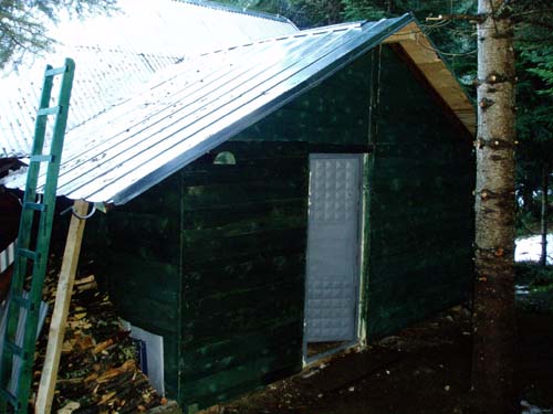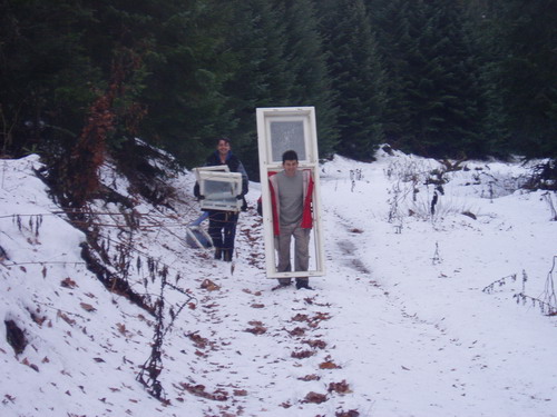 Vozila, naravno, nisu mogla puno da pridju tako da smo morali da nosimo malo dužu relaciju i kroz snežni pokrivač od nekih 25-30cm. Doneli smo ostatak limova za krov i neka stakla za unutrašnje prozore koji nisu bili zastakljeni. Udarnički smo radili i uspeli smo konačno da pokrijemo ceo krov i predsoblje. Sad smo definitivno sigurni da nam vremenske neprilike neće oštetiti unutrašnjost brvnare.