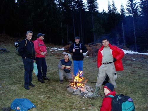 Sad nam je dom bio bezbedan jer su vrata prilično jaka. Ostalo je pitanje kako da prebacimo prozor, lamperiju, izolaciju i letve za lamperiju (koje su se pokazale najtežim od svega jer su bile sirove) od puta do doma. To je rastojanje oko 700-800m (pesimisti među nama kažu da ima i čitav kilometar) i iskustvo od prethodnih vikenda nam nije davalo mnogo elana. Nosili smo se mišlju da opet angažujemo neki traktor iz sela da tovar bar približi domu (do ispod brda - kako mi kažemo). Na sreću po nas, Đani Šverko (bivši vozač Formule 1 - za mlađe koji ne znaju) iz PD "SANDžAK" - Sejo, uspeo je da doveze svoj kombi do "ispod brda" i tako nam mnogo ublažio muke. Ovo, naravno, nije prvi put da nas Sejo sa svojim "SECO" kombijem spasi nošenja teškog tereta. Za ovu zimu su preostali samo unutrašnji radovi i sve će ići puno lakše. Užitak u brvnari je kompletan ali da ne bi zaboravili kako je to u prirodi morali smo da zapalimo jednu malu logorsku vatru i uz nju malo da proćaskamo.